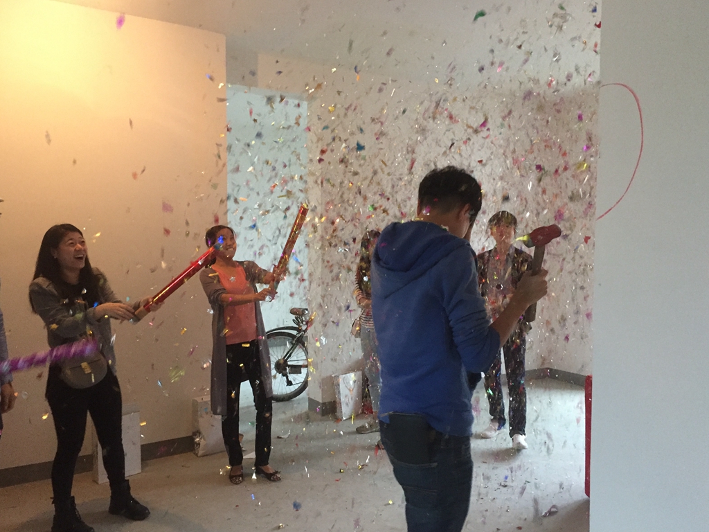 ▲伴随着飘飘洒洒的礼花散落而下,业主的定音锤敲响,寓意着新家装修正式开工。