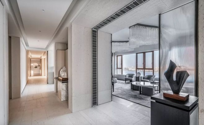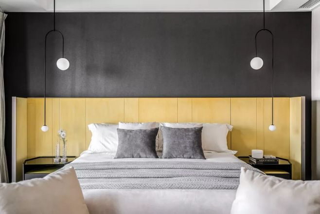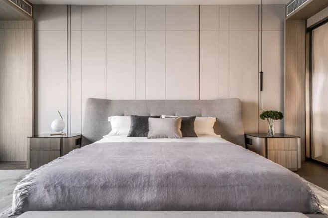 主卧室空间中低调柔和的色彩和优质家具营造出简约而高贵的休息空间。极简主义灯光,艺术和枕头颜色的不对称组合,以及地毯上的景观反射打破了空间的单调,突出了室内的独特审美风格。