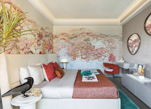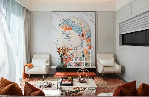 画中的花鸟与瓶中的花草互为呼应,房间内无声的吱喳与院子轻微的蝉鸣,相映成趣。设计师用现代手法打破空间固有形态和色彩。丰富空间趣味性同时也收获了生活的平衡与和谐。