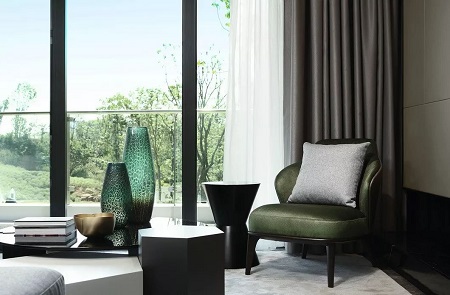 茶几上的一组玻璃器皿,通透、性感而活波,造型经典,色彩含蓄又张扬,点缀其中有种心猿意马,方落凡尘之感,让人眼前一亮。