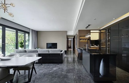 从客厅到餐厅,设计师用“灰”坐稳中庸,再将其他色彩有度的展开,表现了张与弛的分寸感。