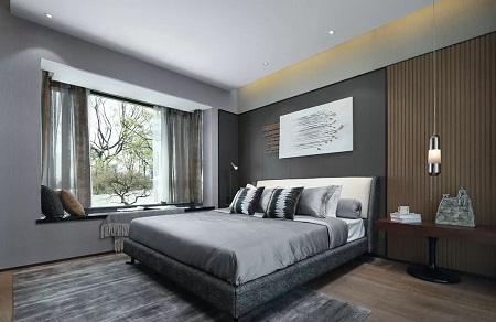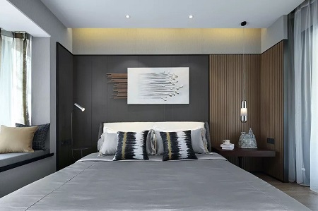 卧室的设计,是一匹勒住了缰绳的骏马,四蹄着地却张力犹存,想象着光亮的灰色床褥与光洁的雪白肌肤相互映衬,是何等的性感。