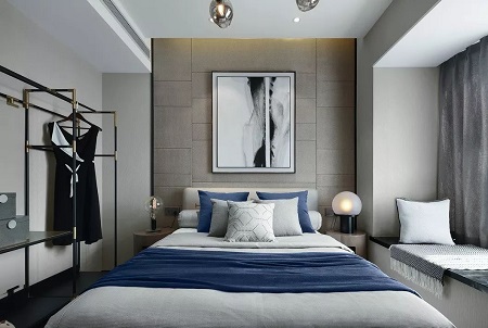 次卧的设计老道自如,青蓝色稳住了场面,在静谧的空间里,流露出笃定的暖意,装饰画潇洒而节制,配合的相得益彰。