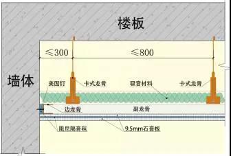 第二层是底层石膏板,紧接着铺设的是“阻尼隔音毡”,能隔绝约 30dB的噪音,之后再铺设面层石膏板,这样几项合计隔音可以达到 50-60dB,一般楼上能传来的噪音基本上被隔绝了。