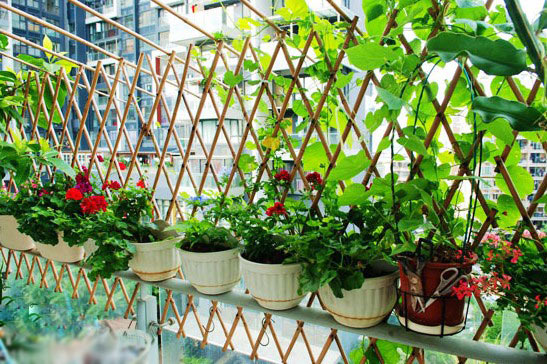 根据当地气候和各人爱好,栽植各种花木。花木的种类,既有常绿的盆景,又有四季鲜花;既有葱笼的树叶,又有耐旱的球茎;有的柔软垂吊,有的舒展延伸;有的可观赏花叶,有的可结出硕果,形成一个小百花园。为了夏日遮阳,可以种植牵牛、金银花、葡萄等,并在阳台东晒或西晒一侧牵扯细绳,让它们攀缘而上,形成一个绿色屏障,不仅形成立体式绿化,还可降低室内温度。北面阳台还可以盆栽和放置一些万年青、君子兰、兰花、四季海棠等耐阴植物,会使阳台显得格外清新,幽雅宁静。