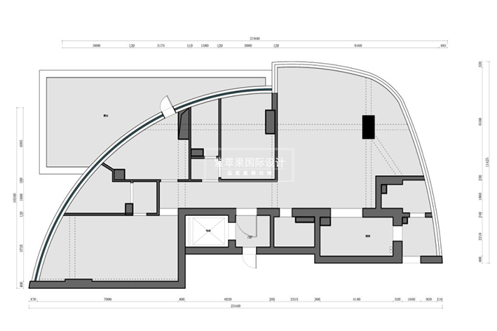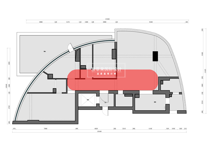 原始户型中,进门比较狭窄,而且过道很长,没有实际的用处,虽然空间看起来很大,但圆弧的建筑外观,使得套内实际使用面积降低,唯一的户型优势是全落地玻璃,包括卫生间的玻璃都是落地玻璃。