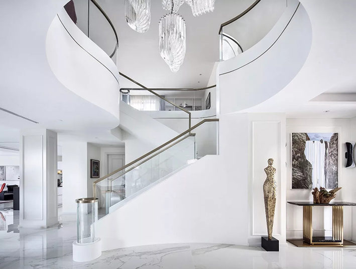 以曲线来实现上下楼的连接,美观,而且可以做得很宽,没有直梯拐角那种生硬的感觉,是行走起来最为舒服的一种;既避免了折梯的生硬,也没有旋梯的不安全感,可以说是最为理想的楼梯;但一定要有足够的空间,才能达到很好的效果,这种楼梯是大复式与独栋别墅的首选。