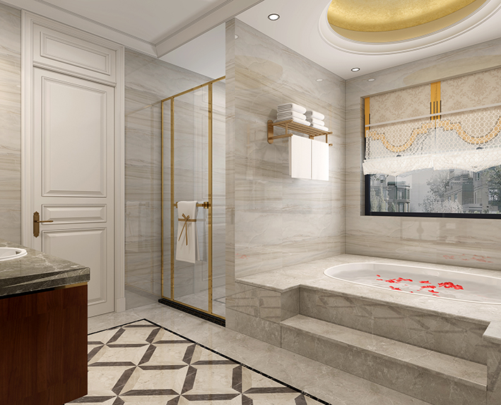浴室的墙壁面积最大,须选择防水性强,又具有抗腐蚀与抗霉变的材料。容易清洗的瓷砖、大理石、马赛克等花色多,可拼贴丰富的图案,且光洁平整易干燥,是非常实用的壁面材料,但要注意与地面材料色彩相统一。