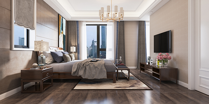 简美轻奢卧室装修效果图展示了简美风格的温馨舒适,带着一丝恬静,一丝柔和。时下流行的米黄色,天然木的清爽配色,把主卧空间点缀得十分亮丽,超大床搭配实木床头柜,相得益彰,古典优雅令人着迷,将简约温馨镌刻在美式情怀中。