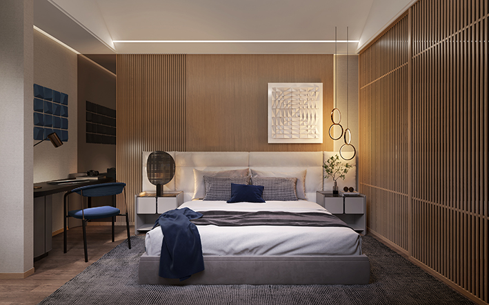 卧室灯光为了在活动舒适和睡眠不受刺激,可以在床的两边各安装一个壁灯或者床头灯,并且把开关分开设置。