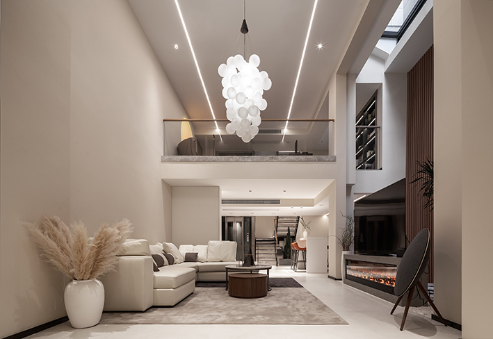 如何让较大的空间丰富多姿而不空荡荡?隔断也许是不错的选择,而软隔断则是价格便宜、最易打造的最佳之选。紧贴客厅的沙发区域,顶部设立挂杆,悬挂半透的沙质挂帘,将大客厅巧妙隔断,并进一步给予了沙发区更多私密感。