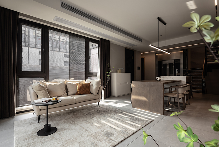 卧室并没有生硬的独立成一个房间,而是采用了布艺隔断让其更为灵动。软隔断像窗帘一样可以往两端收起,就寝时则将其展开,给予卧室以小空间从而展露温馨感。