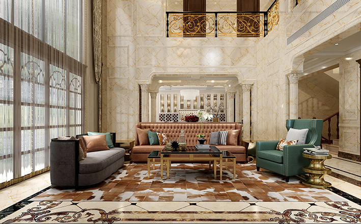 别墅客厅既然是整个大宅的门面担当,颜值视觉设计非常重要,整体色彩和谐统一,营造轻松舒适的交流空间,整体设计对称协调,图案材质照相呼应,背景墙不宜过度装饰,采光通风效果要格外注意,利用灯光照明让客厅更加通透明亮。