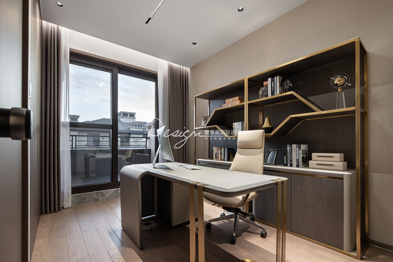 4.书房中照明灯的高度也是考虑的要素之一,台灯一般选白炽灯,其瓦数在60瓦左右为佳,太暗会伤害眼睛,太亮刺眼也是对眼睛的伤害。此外,写字台面的大小高度也重要,台面的大小可以根据手活动的范围或工作需要的配置和书籍灯物品来决定。