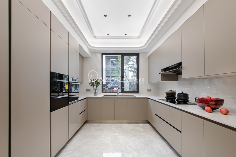 3、橱柜台面高低一致,辅以嵌入式煤气灶,增加美感。
