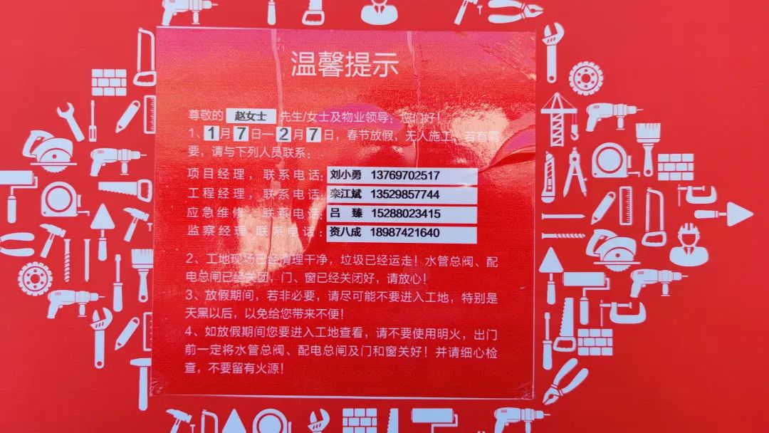 项目经理还会在门口张贴【温馨提示】,