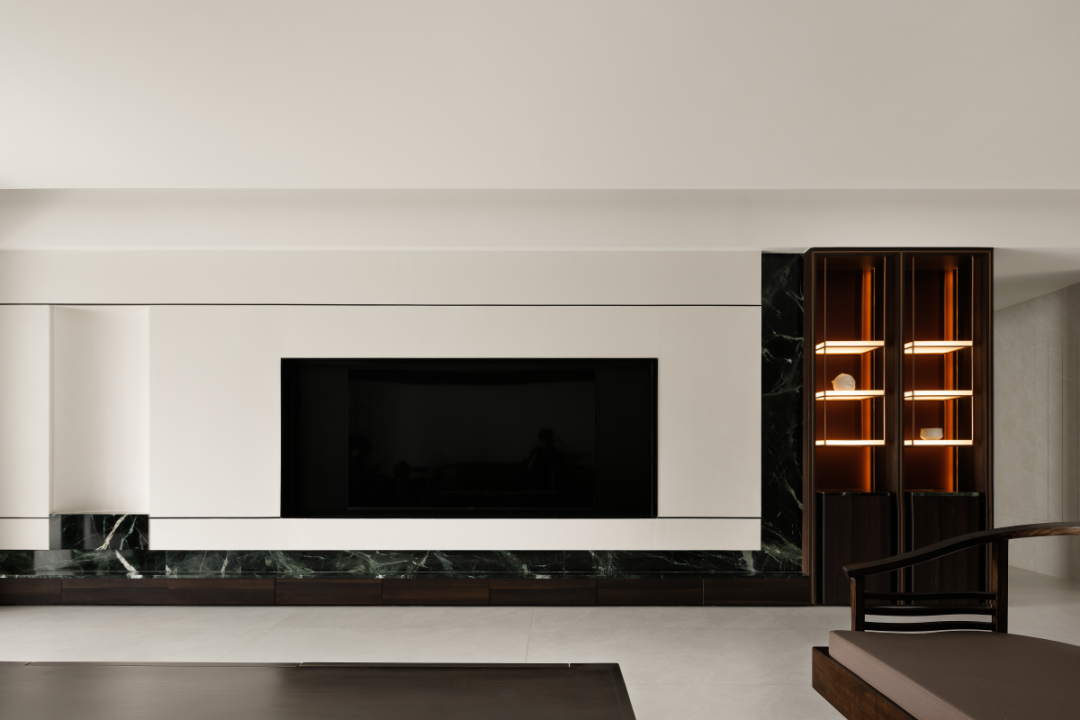 电视背景墙选择与天花板连接,萦绕在广阔而温暖的光感中,首先建立对称的形式,然后结合沉浮的造型气势,以淡泊的语境衬托大理石的高贵沉稳,并描述密集的光影层次,唤起展览空间的精致风格和灵动。【预约量房】