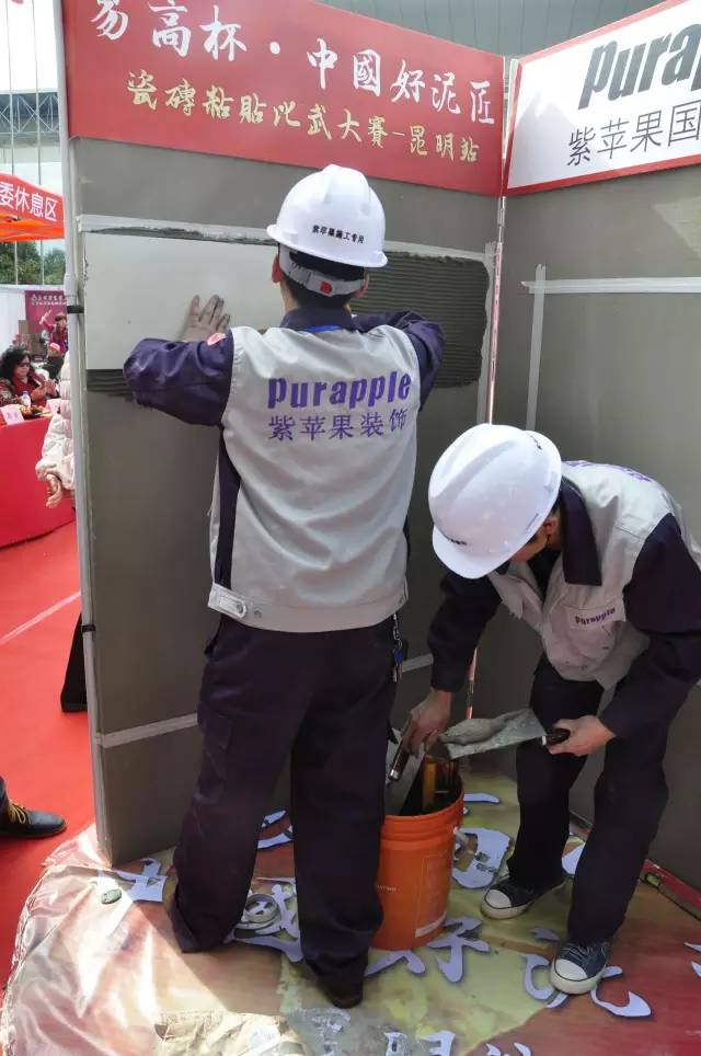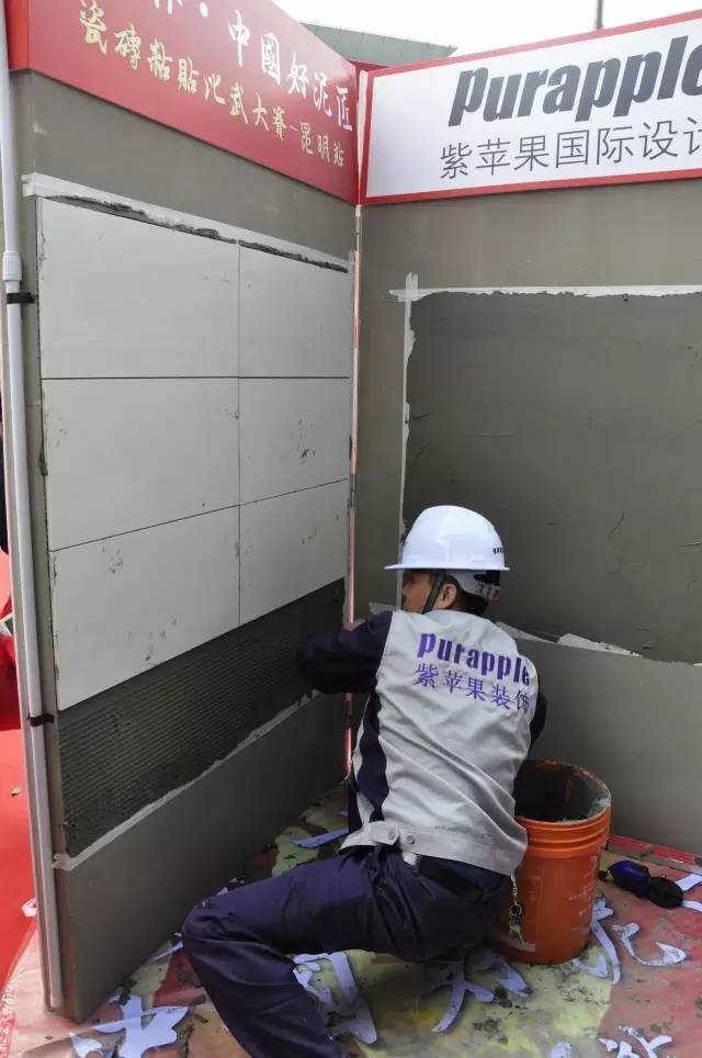 瓷砖粘贴比赛现场,紫苹果装饰泥作师傅正在贴砖