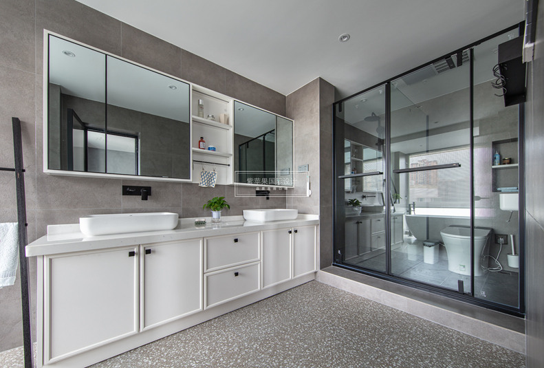 在宽大的卫浴间里,干湿自然分离,良好的物理环境使得浴室柜有着充裕的容身之处。设计师可以根据使用者的功能要求和审美需求来放置不同形式的浴室柜,各种洗浴用品、清洁用品以及衣物等分门别类地置放。另外,还可以根据家庭成员来分类,使每个人都有独立的储物空间,让使用者更方便、卫生。
