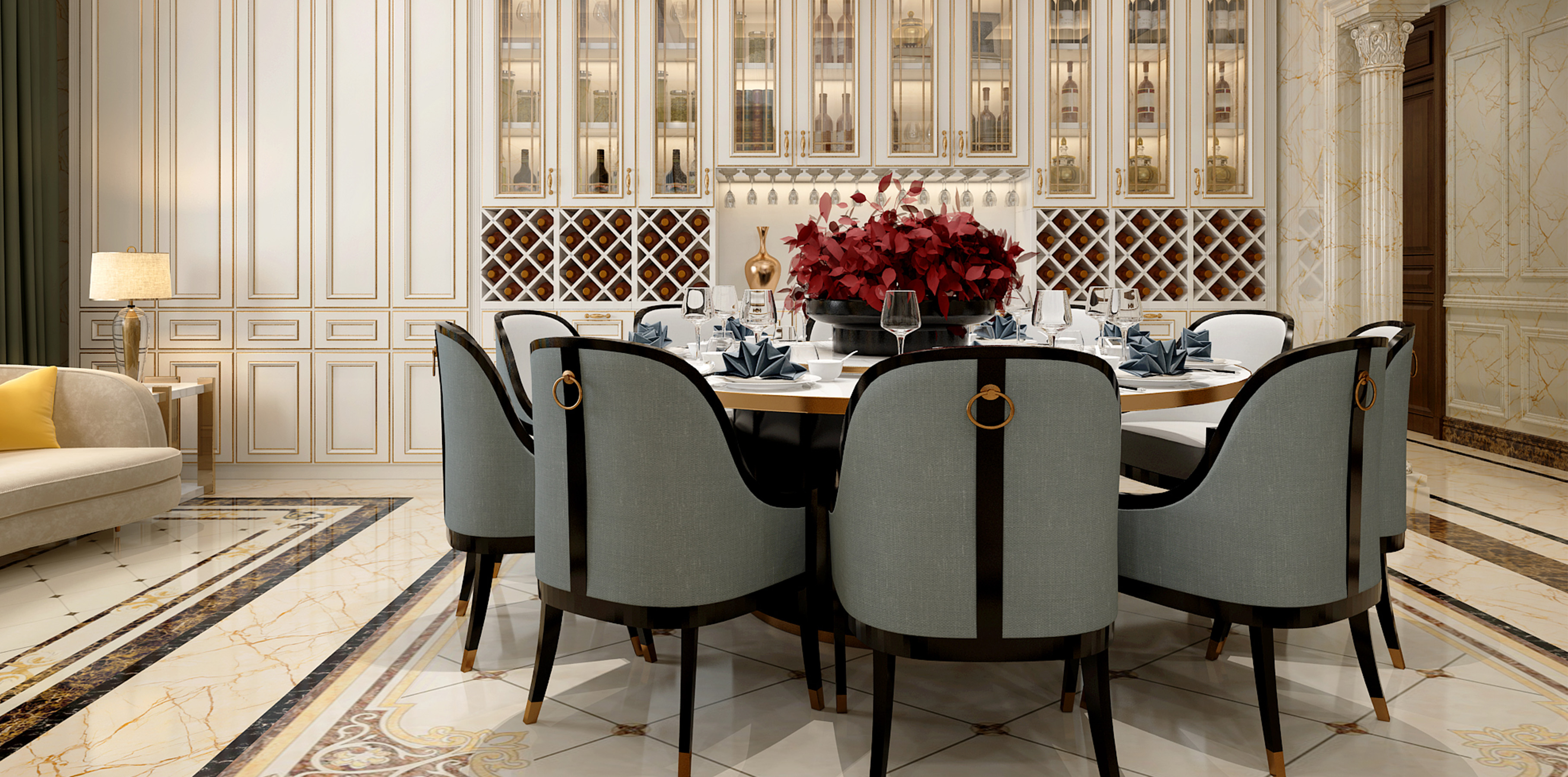 墅装修餐厅的装饰不能只考虑视觉效果,还应考虑到餐厅的实用性。不仅漂亮,而且更实用,更有意义。所以配置一些风格上与主旋律一致的实用家具,会进一步提升整个餐厅的水平。