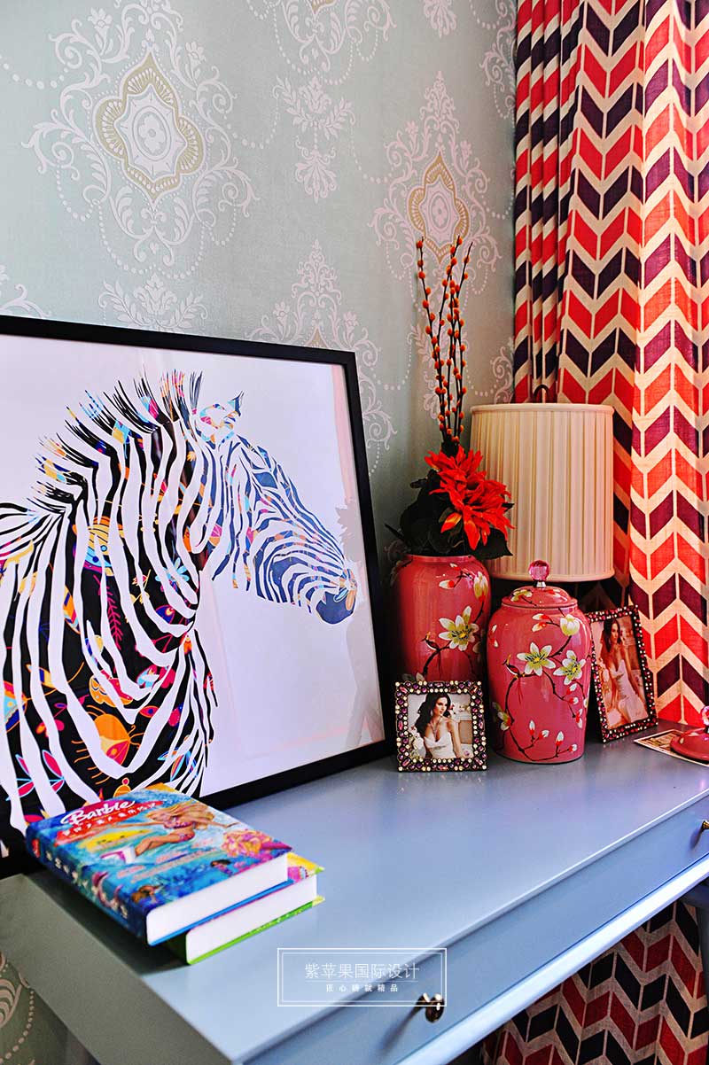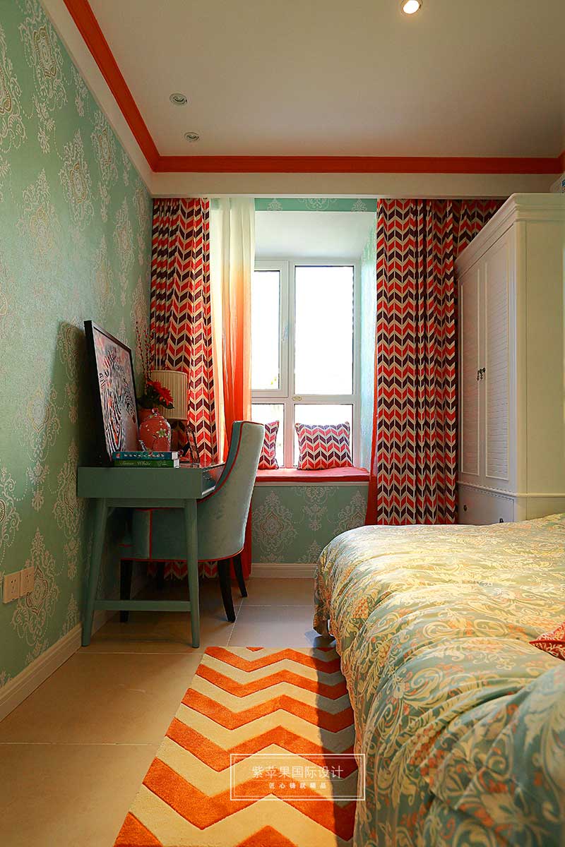 蓝色、橙色为主色调,打造温暖、阳光、清新的卧室。橙色在斑马纹、桌椅、地毯的使用上,就算是只作为装饰点缀也能获得非常棒的视觉效果。
