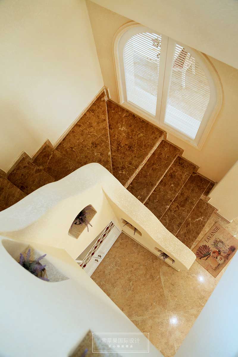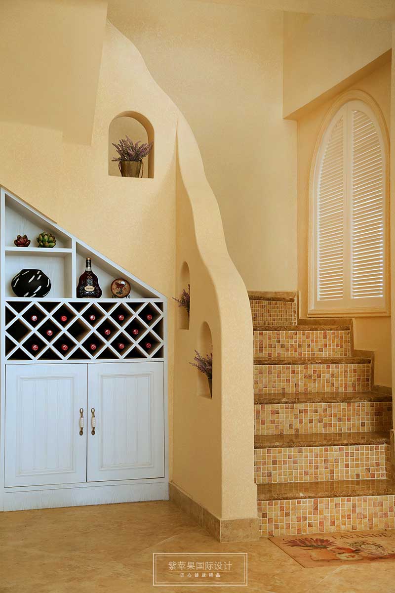 楼梯这边扶手,给人的感觉更为自然,散发着地中海的那种休闲气息。巧用空间设置了一个简易的酒柜。