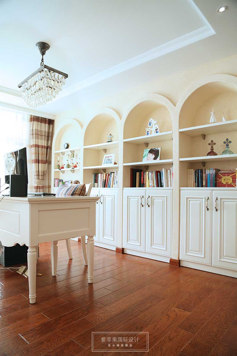 白色的书房依旧延续整体风格的简单与安宁。弧形书柜柔化空间的线条,大面积储物空间,既有充足的空间摆放书籍,也可以方便业主为来客展示自己家人的回忆和自己心爱的藏品!