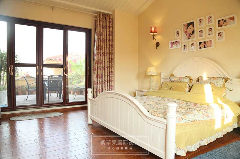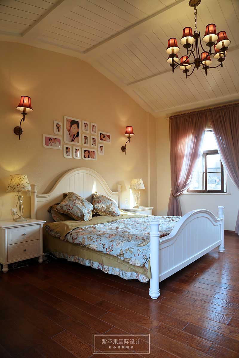 弧形的屋顶让空间的视线得以延伸,花纹床品为空间注入一股清新的春意与田野的味道,当纱质的窗帘随风起舞,使得阳光从缝隙中偷偷进入,倾泻至床上,撒上一片芬芳,每个清晨,让温暖、自然的阳光叫醒自己,何尝不是业主要的幸福生活。