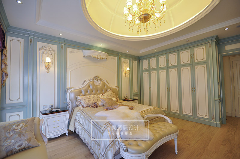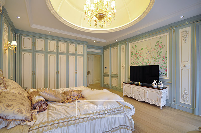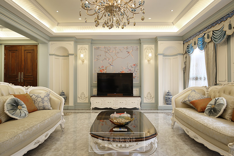开放式的空间结构、随处可见的花卉和绿色植物、雕刻精细的家具……所有的一切从整体上营造出一种田园之气。Tiffany蓝的纯粹,灵动,浪漫又优雅,让很多为之痴狂,设计师将它融入在空间里,在白色墙面,白色家具的衬托下,显得空间清澈纯净,如丝般流动柔滑,一股浪漫的气息在空间里肆意流转!
