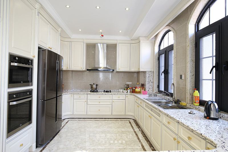 白色的橱柜加白色的大理石地面和花式台面,厨房给人的感觉清洁,明亮,视觉上很舒服。