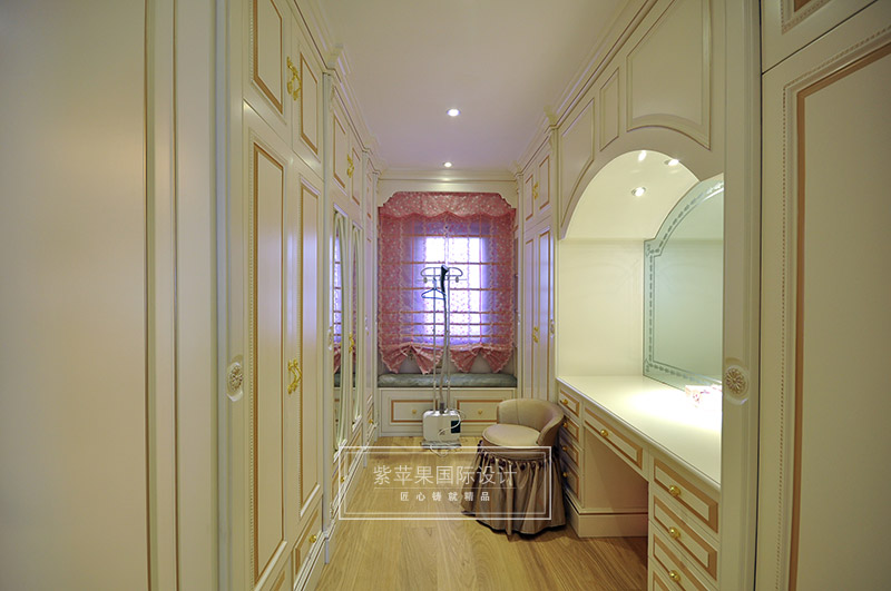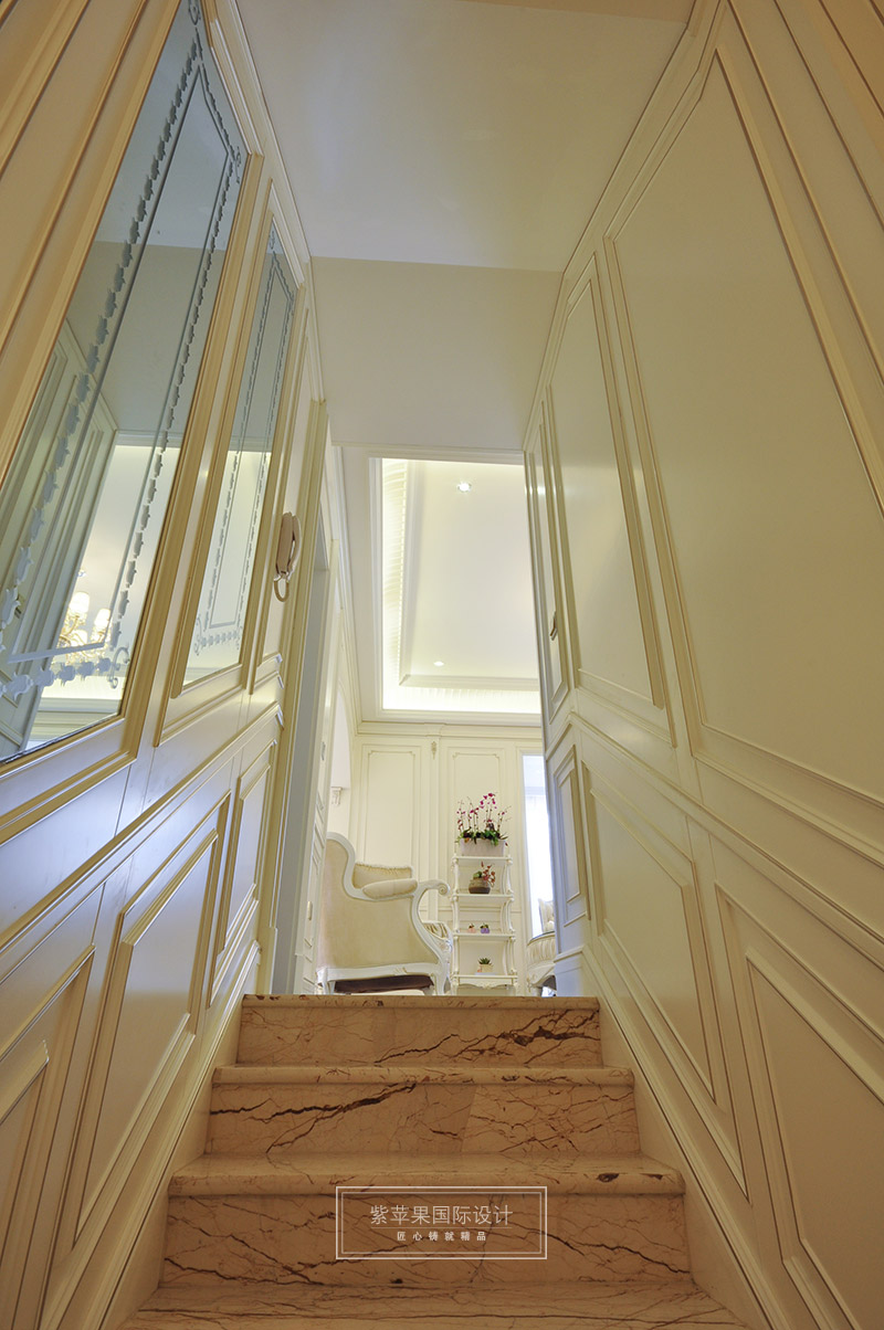 过道处的细节处理上,制作工艺清细考究,在壁灯柔美灯光的映衬下,造旧白的色泽十分干净,简单不失高雅气息。简洁自然的线条勾勒出过道空间的浪漫典雅。
