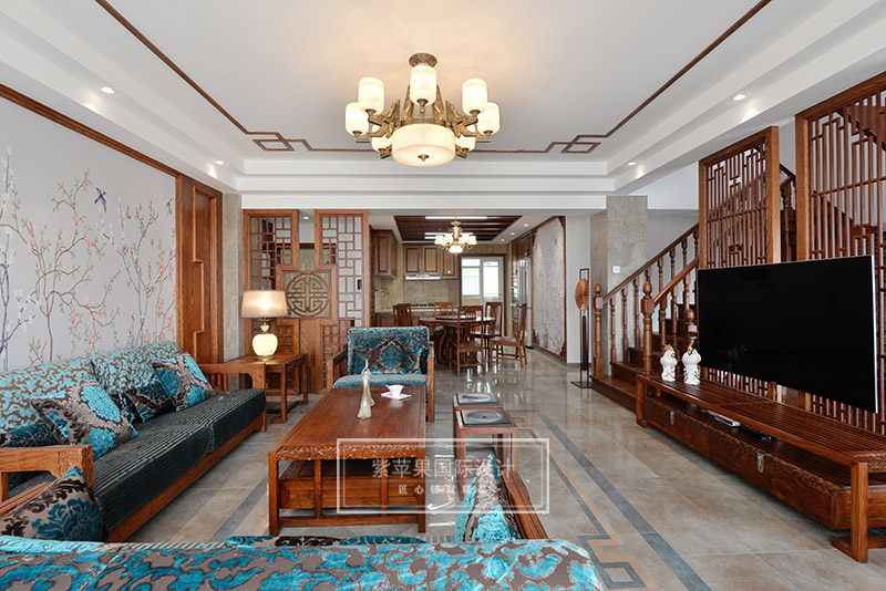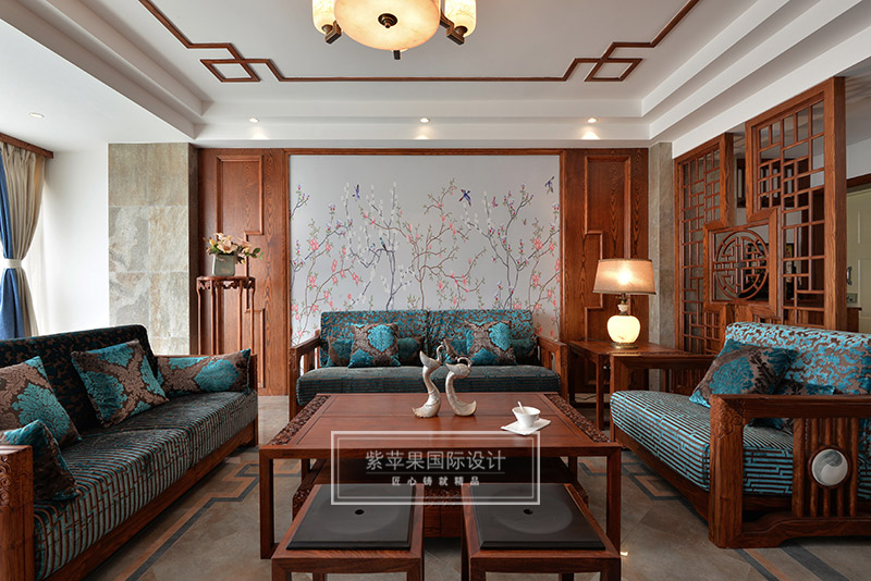 客厅的回纹吊顶和中式吊灯,搭配传统韵味中式家具,形成了一个古雅清新极富传统魅力的客厅空间。客厅家具实木色泽,细致做工,花纹精美,散发着古色古香的韵味,与背景墙上灰色花鸟主题的花纹相互映衬,感受清雅精致,温馨惬意。