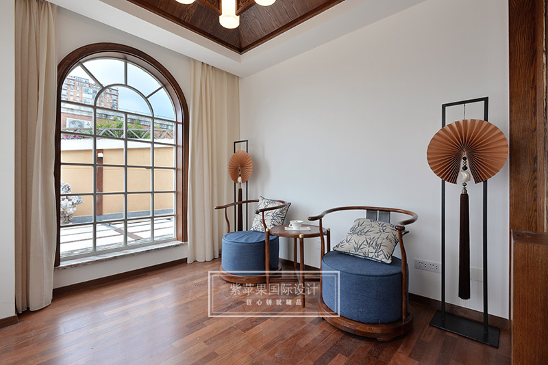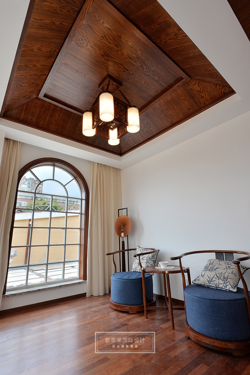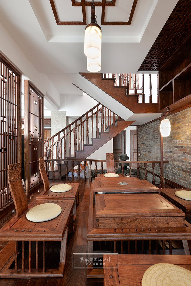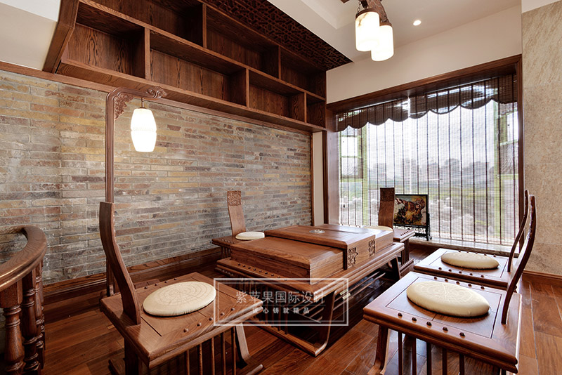 茶室与客厅也是运用木格花进行简单隔断,运用地面材料的变化进行空间划分。茶室空间延续客厅实木色调,因为品茶本身的器具会非常多,茶室的装饰方面则变得简洁起来,选用的家具都是线条比较流畅、造型简单的中式家具,虽简单却不失韵味。茶室旁边还有个室内假山的景致,与家人或是亲朋品茗聊天之时,又可听到潺潺水声,更有一番世外桃源的感受。茶室墙面保留了原有的锈石砖纹路,保留了老房子气息,复古又有韵味。特别放置的吊灯和宫灯,也作为点睛之笔,为整体空间增添古色古香的传统气氛。