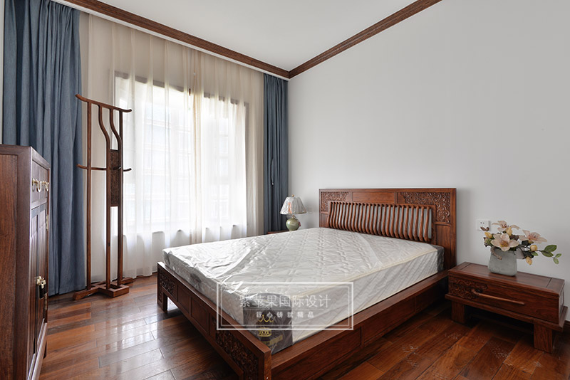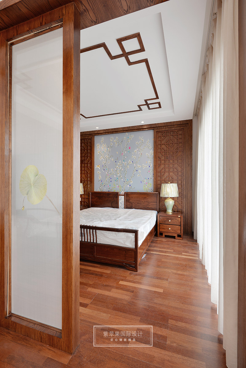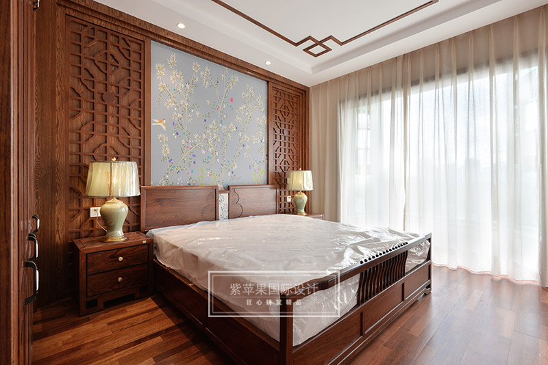 主卧与客餐厅风格一致,在灰色花鸟主题背景和回纹吊顶的映衬下,中式韵味在卧室空间里也获得尽情展现。