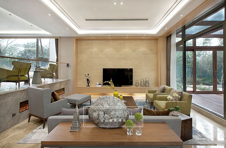 科技木的运用和隐藏窗帘的设计,配合大面积落地玻璃门窗,形成一幅清新自然的绿色景观画。这是将美好自然景观与日常生活巧妙结合,借景入画,增强家居美感。