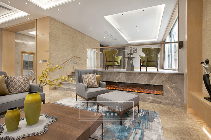 客厅设置内嵌式电子壁炉,巧妙创新有乐趣;错层处运用玻璃扶手,增强整个空间通透之感,让视线广阔无遮拦。电子壁炉和玻璃扶手的运用,都可以看出设计师从细节出发极力在营造一个精致、大气、现代感十足的生活空间。